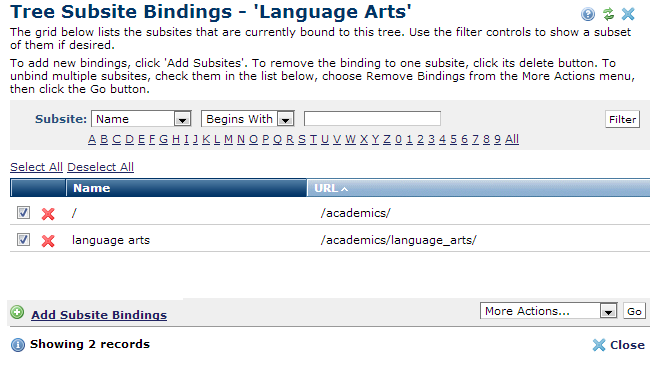 Click Add Subsites to create new bindings for this tree. To remove individual bindings, click the remove icon , or select multiple subsites, choose Remove Bindings from the More Actions dropdown, then click Go.