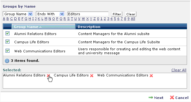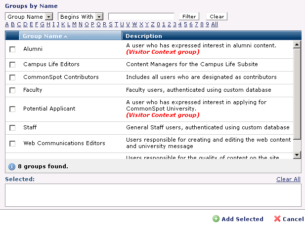 Click checkboxes to select groups.  Choices display in the Selected box. Click the remove icon   to deselect individual groups, as shown below, or click Clear All to deselect all groups.