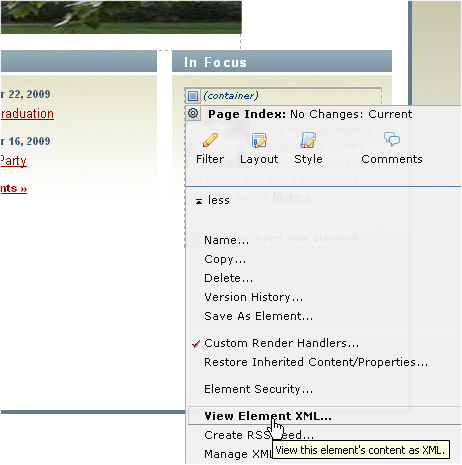 To see XML output for an individual Element supporting Custom Render Handlers, open a CommonSpot page in Author mode, click the Element edit icon and choose View Element XML.