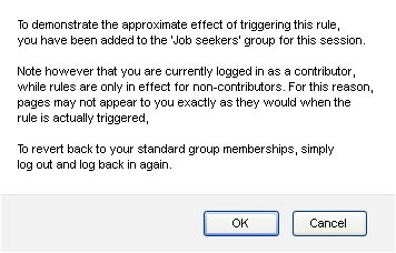 You are automatically added to the visitor context group for this rule. To view pages rendered specifically for this group, browse those pages. Note that, as described in the dialog, your experience as a contributor will differ from that of an anonymous visitor. To more accurately view what anonymous visitor context group members will see, log out, then using a different browser, access the site as a non-contributor, follow the navigation path that triggers the rule, and visit pages scheduled for your visitor context group.