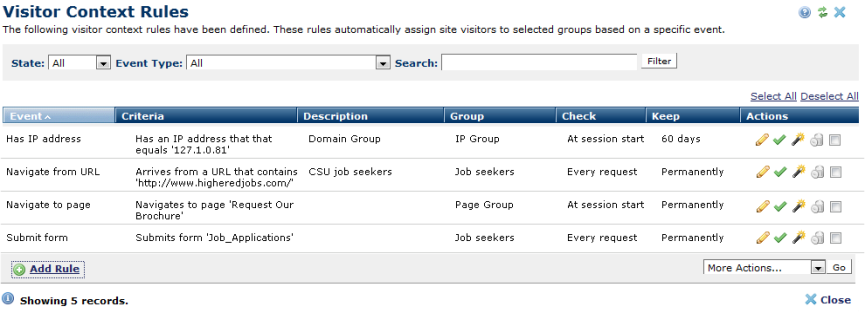 You can toggle active or inactive state for rules, or select multiple rules, and use the More Actions dropdown as described below. Use this feature to delay rule activation or to temporarily suspend rules. Deactivating prevents triggering a rule for future visitors, but not for visitors with a cookie indicating that a rule was triggered in the past. CommonSpot returns these visitors to the related group on next visit.