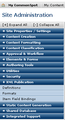To access XML options, click XML Publication in the left panel of the Site Administration dashboard.