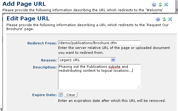 Expire Date: Optionally enter a redirect end date through the calendar icon, or clear an existing date. Once a redirect expires, visitors to the "source" URL receive a 404 (File not found) error and the redirect record is removed from Manage Page URLs and Manage URL Redirects. See the Administrator's Reference for details.