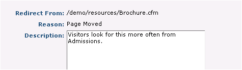 Reason: For moved or renamed pages, displays the reason for automatic redirects, as shown above for a moved page. For manually generated redirects, displays a dropdown for choosing a new reason. Click the dropdown to choose from: