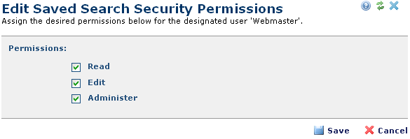 Use this dialog to set permissions for searches you share. From My CommonSpot view All Saved Searches or My Favorite Saved Searches, select a saved search, click and select Edit
