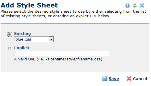 To add a style sheet to a style sheet set, select Add New Style Sheet in the Style Sheets dialog. Before you add a style sheet, it must already exist in a CommonSpot directory or be accessible through a URL.
