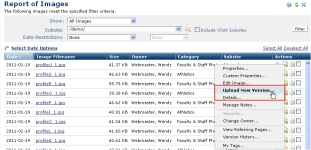 You can also move images between galleries, chooose Image from the New menu, or replace existing images with new versions from the More Actions option within My Images or other Image reports, as shown below. See the description for More Actions in The Image Gallery and Move Image.