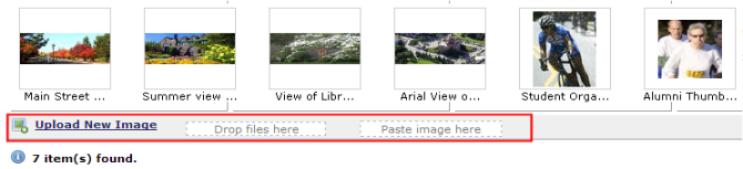 To add an image to the Gallery, drag and drop images from other applications, paste image from other sources, or click Upload New Image at the bottom of Image Gallery dialog. You must have Upload Image permissions for both the source and destination gallery and subsite.