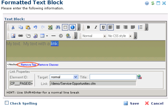 The CommonSpot Insert Link dialog displays. To remove a hyperlink, select or place the cursor in the linked text and click Remove Tag.