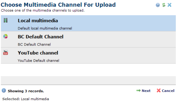 To begin the upload process, click to highlight the target channel, as shown above for Local Multimedia, then click  Next to select a subsite location for your uploaded file.