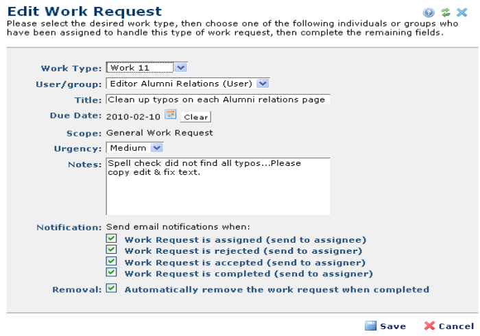 CommonSpot automatically records and tracks task status and optionally deletes completed tasks so you never have to think about following up or removing old requests. This dialog displays in edit mode for existing work requests viewed from Manage Work Requests.
