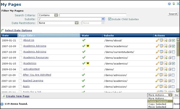Check the boxes for the page(s) you wish to delete and click Delete Selected from the More Actions dropdown. CommonSpot displays Delete Page Confirmation. Click Delete to permanently remove the selected pages or Cancel to exit without deleting.