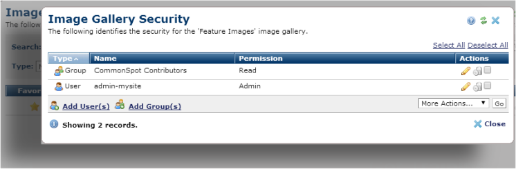 Each Image Gallery in CommonSpot can have its own permissions to control who has access to that gallery. Use this dialog to grant, edit, or remove rights for this gallery for individual users and groups.