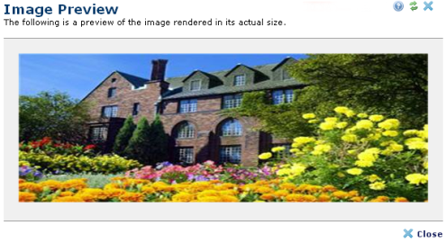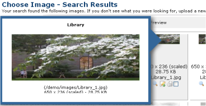 Click the magnifier icon to preview images before selecting or modifying them for your pages. This option is available from My CommonSpot - My Images, image search results, and other image reports. (See the Report of Images and Report of Images by Link Reference in the Administrator's Reference).