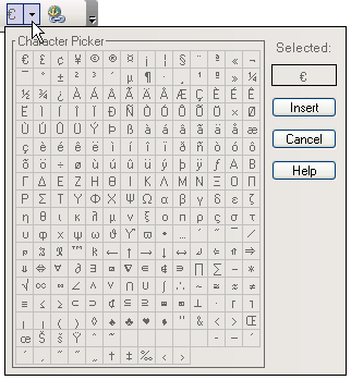 The symbol that appears for the dropdown is the one last used. For example, in the first screen shot below, the default copyright symbol is displayed, but in the second screen shot the Euro symbol is displayed, because the Euro symbol was the last one used. Clicking the symbol itself instead of the dropdown enters that symbol on the page. Use this feature for one-click insertion of frequently used characters.