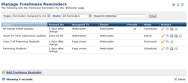 Access this dialog by clicking Freshness Reminders from the Manage menu in author mode to view, edit, or delete Freshness Reminders at your site.