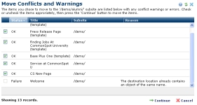 CommonSpot displays a Move Conflicts or Warnings report and completes the move if status is OK once you click Continue.
