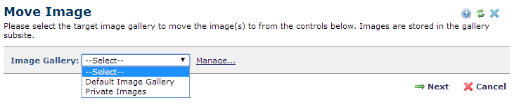 To move an image to a different gallery, pick a target from the Image Gallery dropdown, then click Next. You cannot change the gallery subsite. If you have Manage Gallery rights, clicking the Manage link displays the Image Galleries dialog for viewing or changing gallery content.
