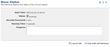 While status is Running, click Cancel Job to exit without moving files or Exit with Job Running to move files without monitoring progress through this dialog.