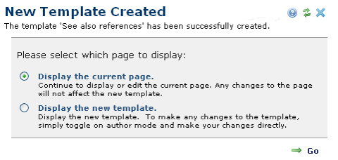 CommonSpot displays this confirmation message when you successfully copy a page as a template. See Copy Current Page as a Template. You have the option of returning to the current page to continue page-level work, or reviewing the new template. Pick the appropriate option and click Go.