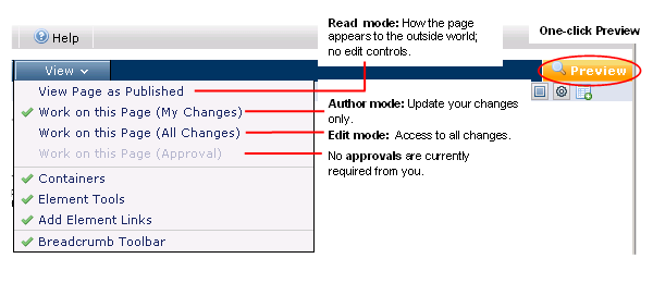 CommonSpot Page View modes present user- and page-specific options. After login, access options from the View menu as shown below.