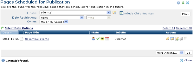 Use this dialog to review all approved pages with future publication dates. Contributors set publication date in the Create New Page dialog or modify it through Standard Properties.