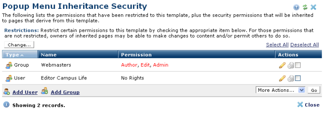 Click the Change button to view or change inheritance restrictions. These settings control which options are available when editing security permissions. See Inheritance Restrictions.