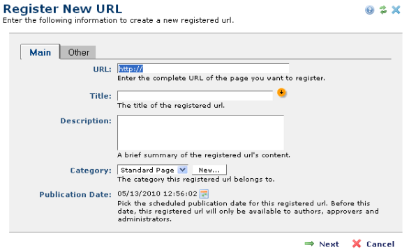 You are here: Contributors Reference > CommonSpot Menus > New Menu > Registered URL > Register New URL