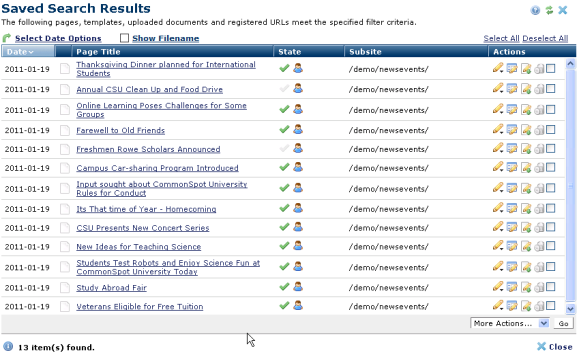 Clicking a Saved Search from My CommonSpot – My Favorite Saved Searches or from Tools –Saved Searches displays Saved Search results.