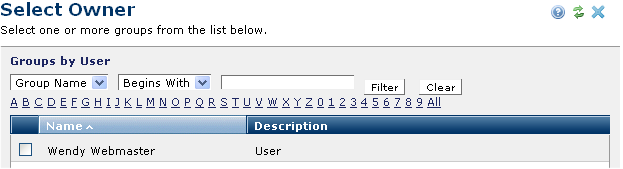 Records created through the Administrator - Group Administration function that include you as a member display in this dialog. You can view Groups by Name or by Description.Group names are alphabetical. Your user name also displays here for selection, in last name, first name, middle name format.