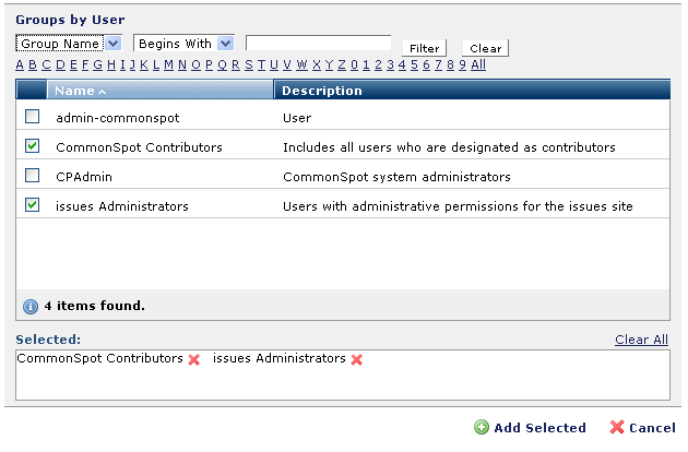 Click checkboxes to select one or more groups. Choices display in the Selected box. Click