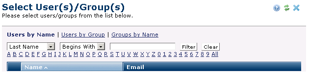 This dialog displays throughout CommonSpot for security, assignment, and routing operations, such as email notifications. For assignments or ownership changes, this dialog displays a list of contributors with edit rights to the page.  View Users by Name or Users by Group or Groups by Name