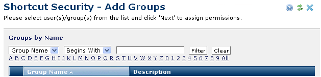 Use this dialog to define which groups at your site can view your shortcuts. Click Add Group(s) from the Shortcut Security dialog.