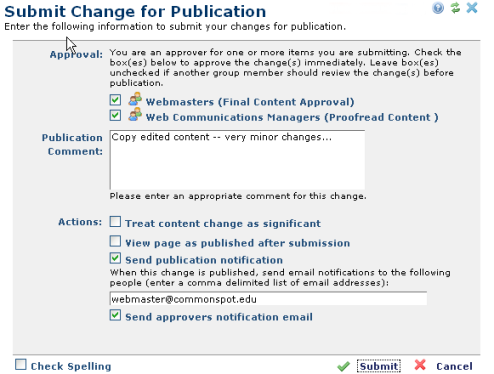 Use this dialog to submit individual changes for publication or approval.  This dialog displays the same fields as Submit All Changes for Publication. If you have bypass permissions, checked boxes indicate levels you can bypass, to publish changes to the page immediately, without review from anyone registered in the Approver Level of the workflow process.