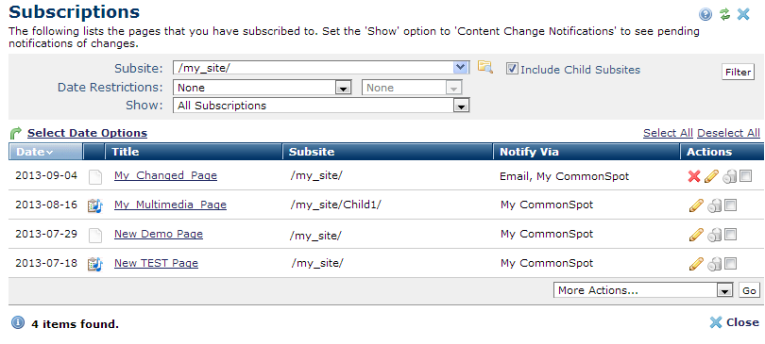 Use the Subscriptions dialog to view or change the pages or feeds you currently subscribe and to review any change notifications received for a specific pages. Access this dialog through Tools – My Subscriptions or My CommonSpot - Reminders - Subscriptions to view a list of pages you currently subscribe to. You can choose to subscribe to change notifications for these pages via My CommonSpot, email, or both. Your site must be configured for email notification - See the Administrator's Reference for details.