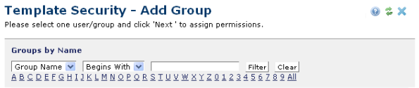 Use this dialog to view or change group security settings for a selected template. Access this dialog by clicking Add Group(s) in the Template Security dialog.