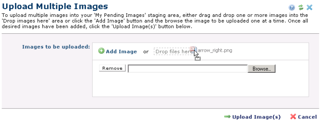 Click Add Image to use the standard Browse option to add one image at a time, or click and drag one or more files to the Drop Files Here box, as shown above for arrow_right.png.