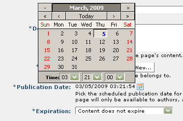 Expiration alerts users to the currency of a given item. Clicking the calendar displays expiration options for this content, as shown below. With the proper permissions, use the Date/Time Selection Control and select a date/time for either expiring content or receiving a prompt to check content freshness. You can specify both a date and time for expiring uploaded files, as well as the action to take.