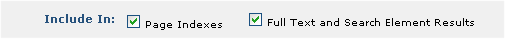 Include In: Controls whether to show/hide this file in Page Index or search results output. Uncheck to exclude from Page Indexes or results returned by Search Elements or full-text searches. Choices here do not affect page display for Choose, Choose Page, or Find operations. Channel security controls which files display to other contributors (see the Site Administrator's Reference).