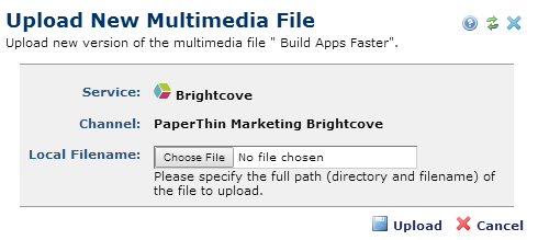 This dialog is similar to the Create New Page, Upload New Document, or Upload New Image. You can upload any file type allowed by the external services used at your site, or any of the standard file types CommonSpot supports for local service. See Multimedia Players - Local Service in the Administrator's Reference.