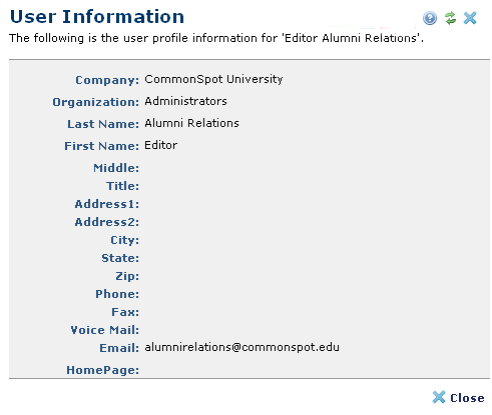Use this informational dialog to view user details for CommonSpot operations that include user data. See Edit User Profile Information in this guide and Add User Information in the CommonSpot Administrator's Reference for more on this dialog.