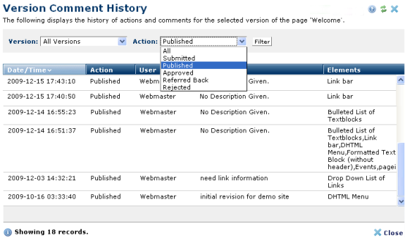 From the Page Versions left panel, click view comment history to review comments at a glance, as well as Elements added or affected by updates, for specific page versions. You can filter by a specific date or all dates or by a specific phase of the publishing process.