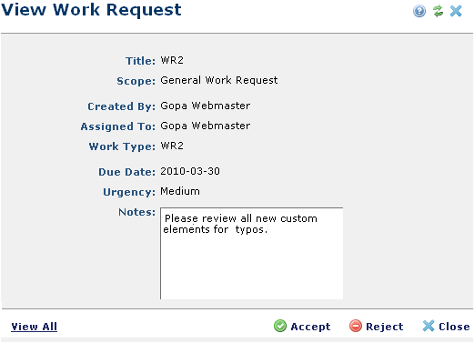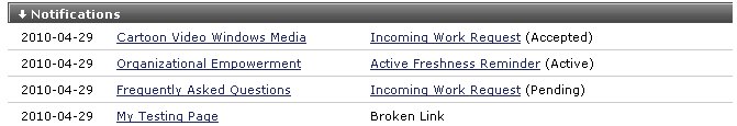 The Notifications section of My CommonSpot displays pending work requests for your review. Click a pending work request to view, accept, or reject.