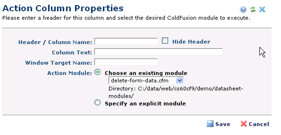 The Action Column Properties dialog box allows you to add or edit additional columns in a Datasheet Element that display hyperlinks to a ColdFusion module. Open this dialog from the Datasheet View Columns dialog box by clicking Add Action Column or by selecting an existing action column from within the Datasheet View Column dialog box and clicking the Edit icon.