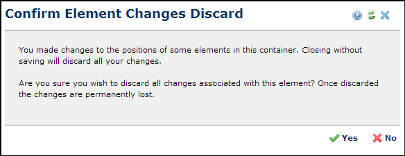 This dialog displays when you reorder elements within a container and then attempt to close the Reorder Elements dialog without saving your changes.