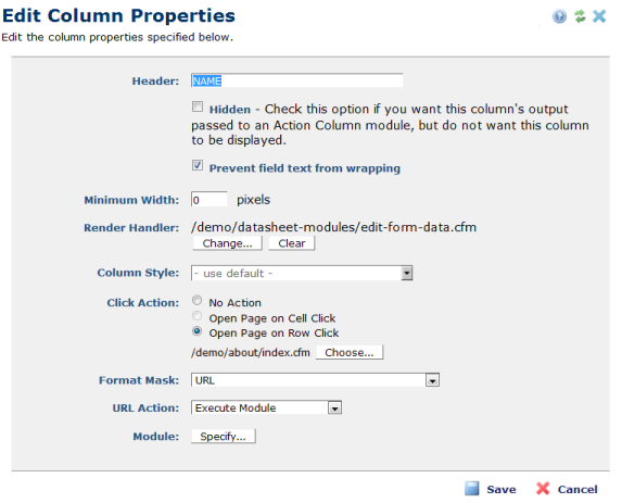 The Edit Column Properties dialog box allows you to control the appearance of each data column in a Datasheet Element. Open this dialog from the Datasheet View Columns dialog by clicking the Edit icon.