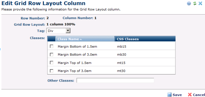 Note that the Tag, Classes, and Other Classes fields may or may not be editable or visible in this dialog, based on the settings defined in Site Admin - Manage Grid Row Layouts - Add/Edit Grid Row Layout. See the Administrator's Reference for details.