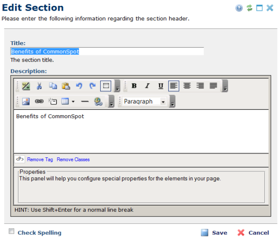 The Edit Section dialog is opened by clicking the ghost text “Click here to define the section header” or “Click here to define the section description”, or by clicking the Multi-section Element tool