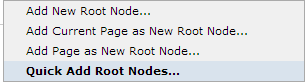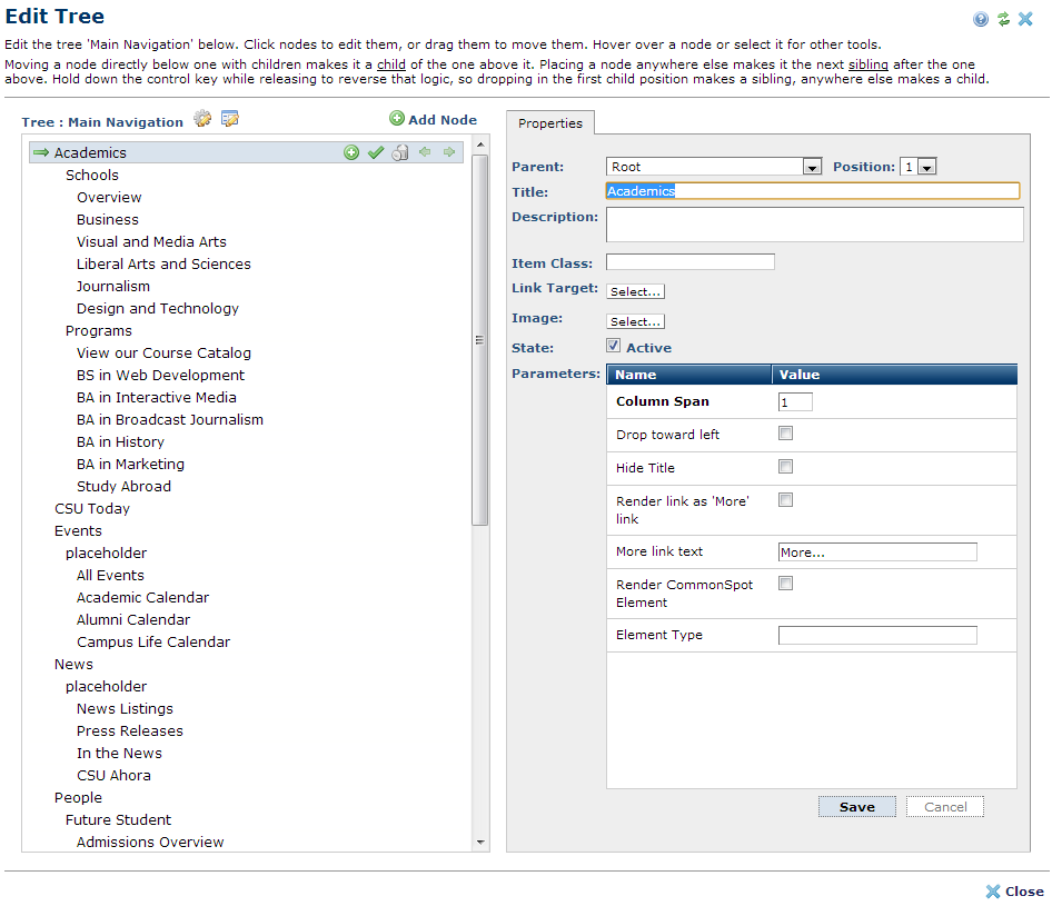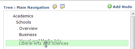 Once you define tree properties, access this dialog by clicking the edit icon for an individual tree in Manage Trees or by choosing Edit Tree from the Tree Element menu at the page level to view or update a tree structure. This dialog also displays from Referring Trees to update links for deleted pages.