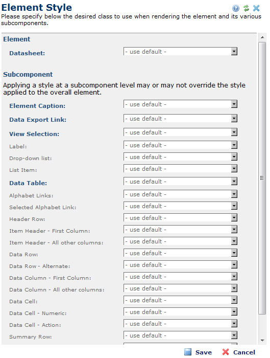 The Element Style dialog allows you to apply style classes to control the appearance of individual components such as headings, labels, or item headers within Formatted Text Blocks, Data Sheets, Page Indexes, and other Elements whose components can be styled. For Datasheets you can use the Element Style options to control the display of each defined view.